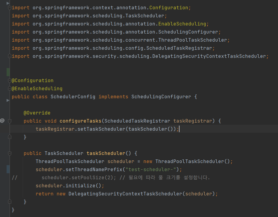 3. 스케줄러를 설정하는 클래스를 생성합니다. `DelegatingSecurityContextScheduledExecutorService`를 사용하여 스케줄러를 구성합니다.